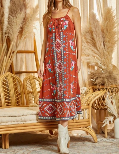 Embroidered Midi Dress With Tie Front Details In Rust In Multi