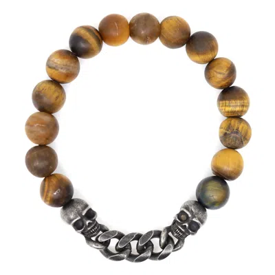Men's Silver / Brown Stainless Steel Skulls & Brown Tiger's Eye Beaded Bracelet In Multi