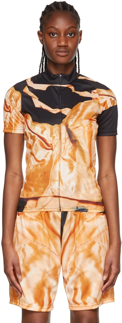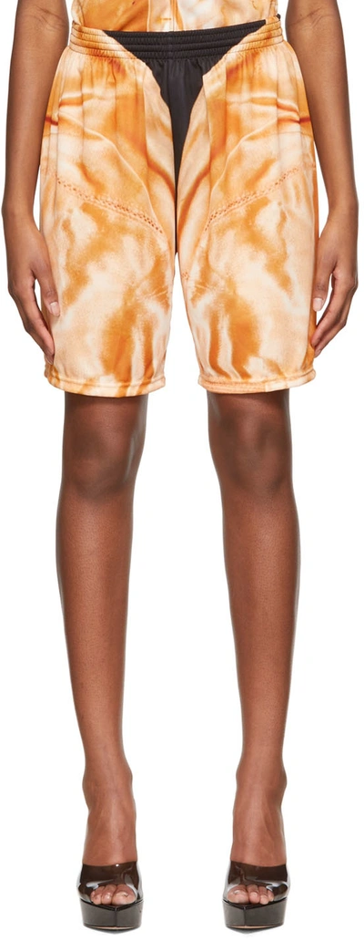 Orange Polyester Shorts In Golden Silk Print