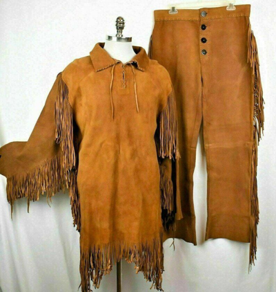 Pre-owned Men's Native American Buckskin Bucksin Suede Leather Fringe War Shirt Pants Suit In Brown