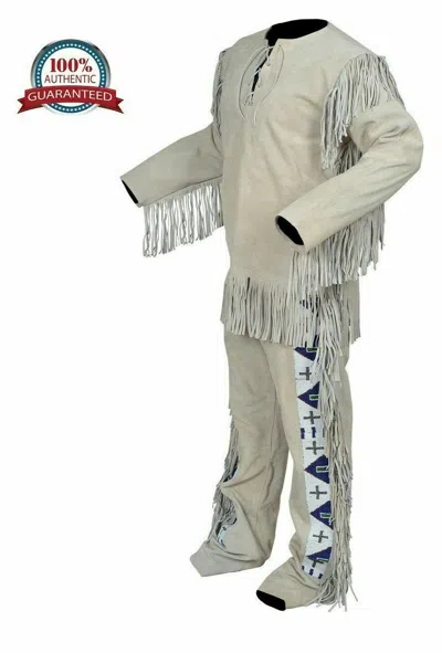 Pre-owned Men's Native American Buckskin Bucksin Suede Leather Fringe War Shirt Pants Suit In Beige