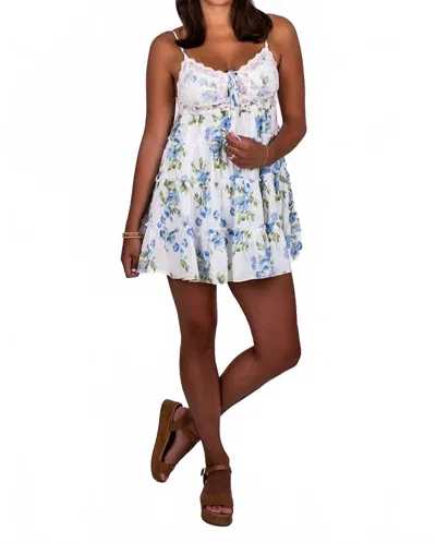 Toile Floral Ruffle Trim Mini Dress In Fade Blue In White