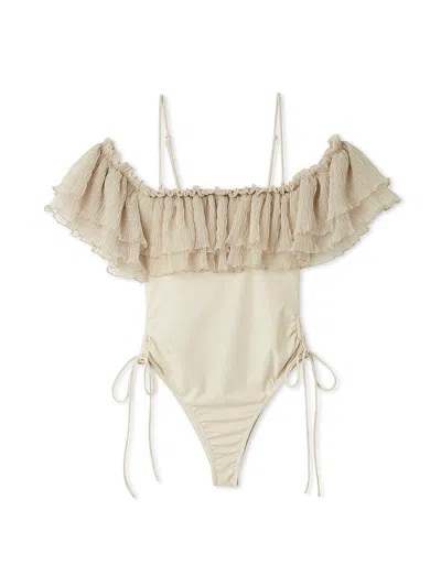 Off-shoulder Ruffle Swimsuit In Brown