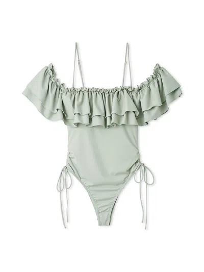 Off-shoulder Ruffle Swimsuit In Green