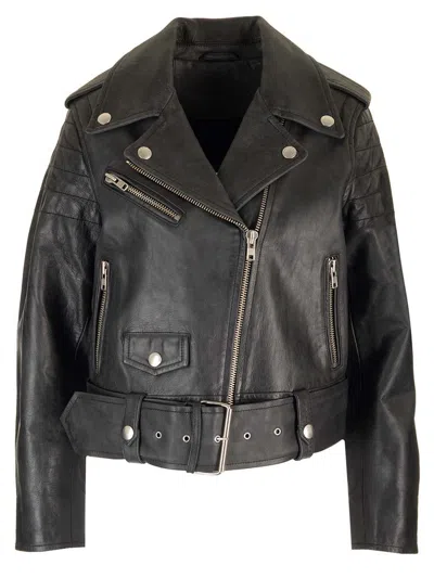 Biker Jacket With Belted Waist And Epaulettes In Black