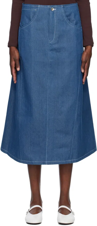 Blue Twisty Denim Midi Skirt In Indigo Denim Wonky