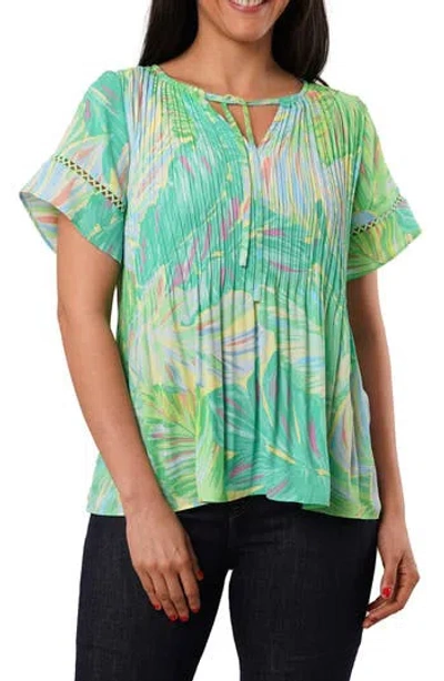 Ruffle Pleated Tie Neck Short Sleeve Top In Green