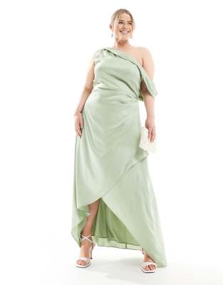 Bridesmaid One Shoulder Satin Maxi Dress With Wrap Skirt In Green