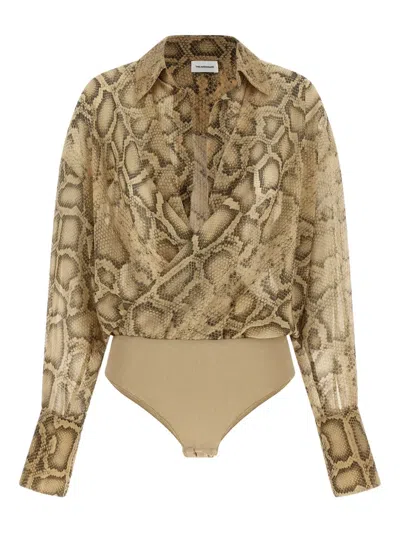 Paloma Snake Print Collared Long Sleeve Bodysuit In Brown