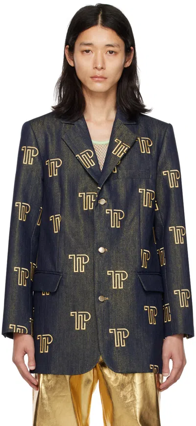 Ssense Exclusive Blue Denim Blazer In Gold Metallic /indig