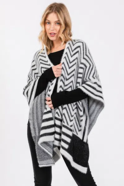 Fuzzy Chevron Pattern Ruana Poncho In White