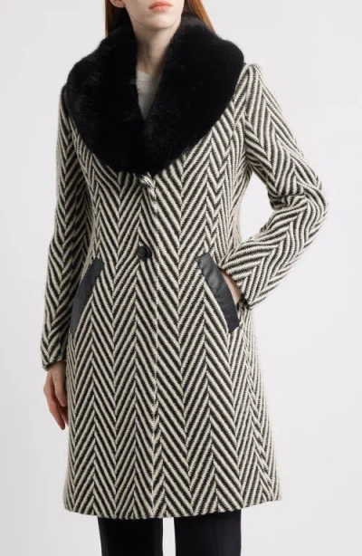 Herringbone Coat With Faux Fur Collar In Jumbo Herringbone