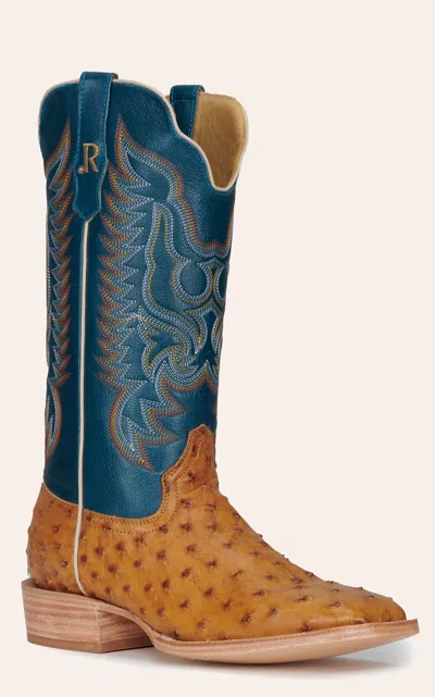 R Men's Antique Saddle Full Quill Ostrich And Royal Blue Wide Square Toe Exotic Cowboy Boots In Multi