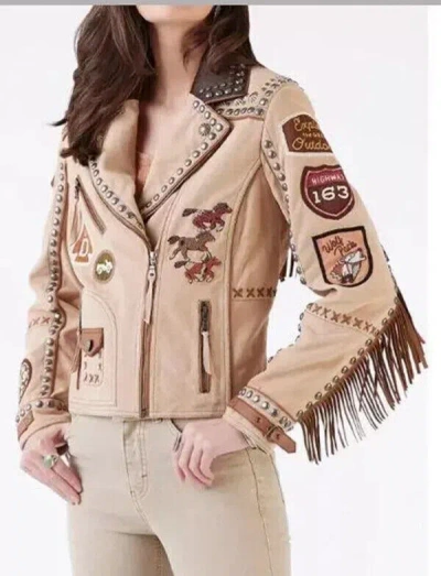 Pre-owned Lainey Women Punk Western Fringes Studded Patches Biker Leather Jacket In Multicolor