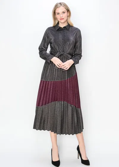 Colorblock Metallic Pleated Midi Shirt Dress In White
