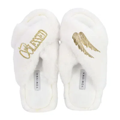 Women's Faux Fur Slippers - Global Recycled Standard Certified - Blessed + Angel Wing Embellishment In White