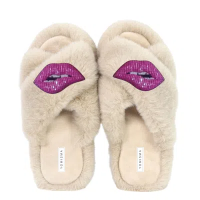 Women's Neutrals Faux Fur Slippers Global Recycled Standard Certified Lips Embellishment -beige