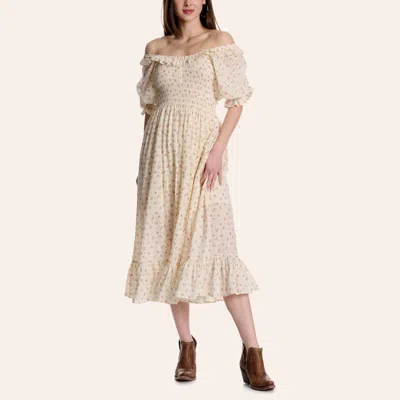 Women's Cream Floral Print Off Shoulder Ruffle Smocked Midi Dress In White