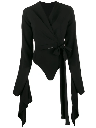 Long-sleeve Wrap Bodysuit In Black