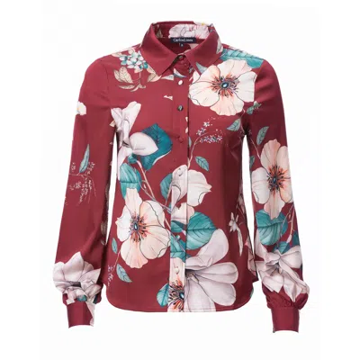 Women's Red Button Down Long Sleeve Shirt In Romantic Floral Print