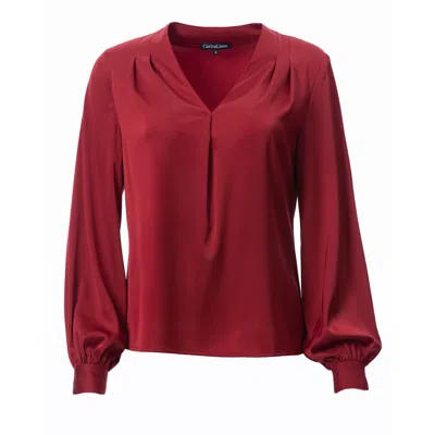 Women's Red V-neck Pleat Detail Balloon Long Sleeve Blouse In Burgundy Solid