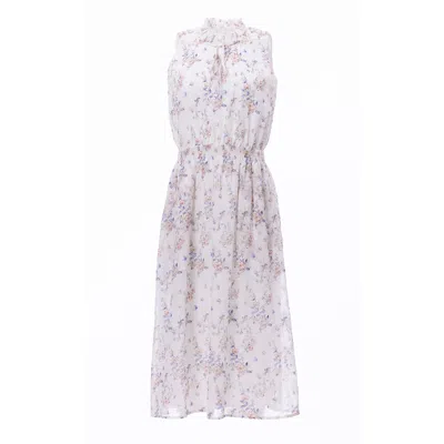 Women's White Sleeveless Smocked Waist Tie Front Dress With Pockets In Romantic Garden Print