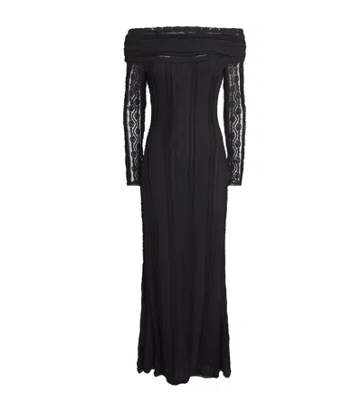 'minerva' Black Long Dress With Bardot Neckline And All-over Embroidery