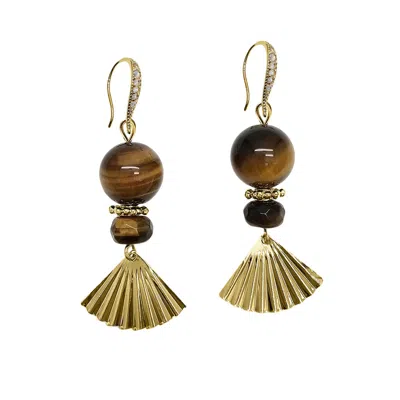 Women's Brown Elegance Tiger-eye Stone With Fan Dangle Earrings