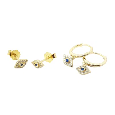 Women's Gold / Blue Minimalist Evil Eye Earrings Gift Set: Gold Plated Dainty Hoop & Stud Charm Earr In Multi