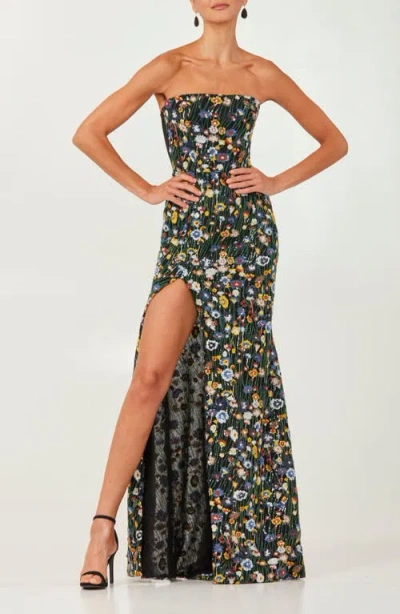 Ophelia Sequin Floral Strapless Gown In Black/yellow Floral