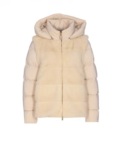 Down Jacket With Horizontal Mink Fur Bands And Removable Sleeves In Neutral