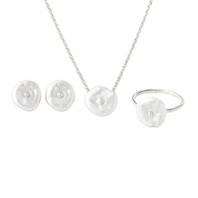 Women's Rozeta Sunrise White Keshi Pearl Earrings, Necklace And Ring Set