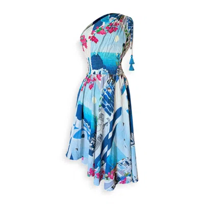 Women's Blue One Shoulder Asymmetry Goddess Cotton Dress With Silk Tassels Santorini Limited