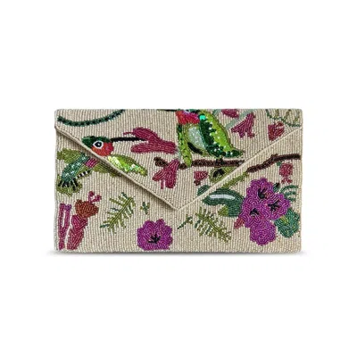 Women's Pink / Green / White Handbeaded Clucth Bag Botanica Bird Ivory In Multi