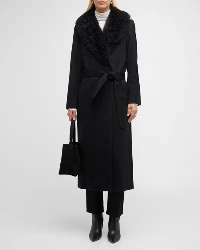 Cashmere-blend Long Belted Wrap Coat With Shearling Collar In Black