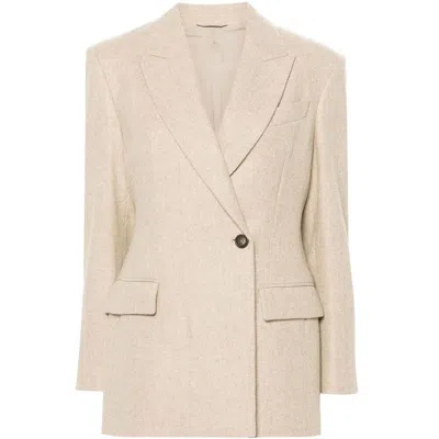 Brunello Cucinelli offers a tailored jacket that exemplifies sophistication and versatility. Crafted with attention to detail, this jacket showcases a tailored silhouette, notched lapels, and a single button closure. It includes two front pockets, providing a polished look for any occasion.- Brand: Brunello Cucinelli - Product Type: Blazers - Materials: 73% viscose, 27% linen - Color: Neutrals