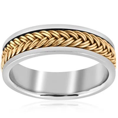 This popular men's wedding band features a 14k yellow gold hand braided design. The flat edges are made of 14k white gold.