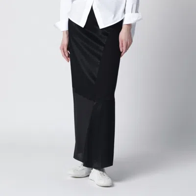 Black skirt by 6397, featuring a patchwork design with mixed fabrics creating glossy and matte areas, a sheer panel at the hem, a slightly A-line fit to the ankle and zip closure.