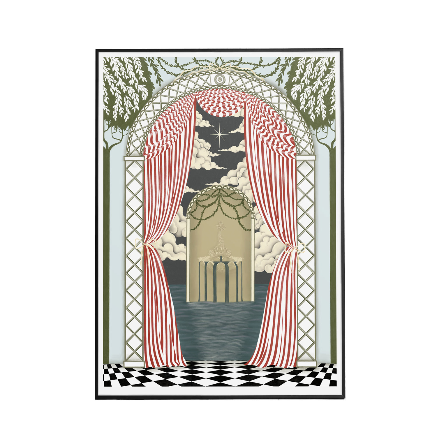 Giclee signed fine art print illustrated by Abi Overland. Escape the world and dive into the surreal Dreamscape. With inspirations drawn from ornate botanical wall murals, surrealism and theatre set designs. All prints come unframed. Giclee fine art print using quality archival inks, printed on 300gsm paper.