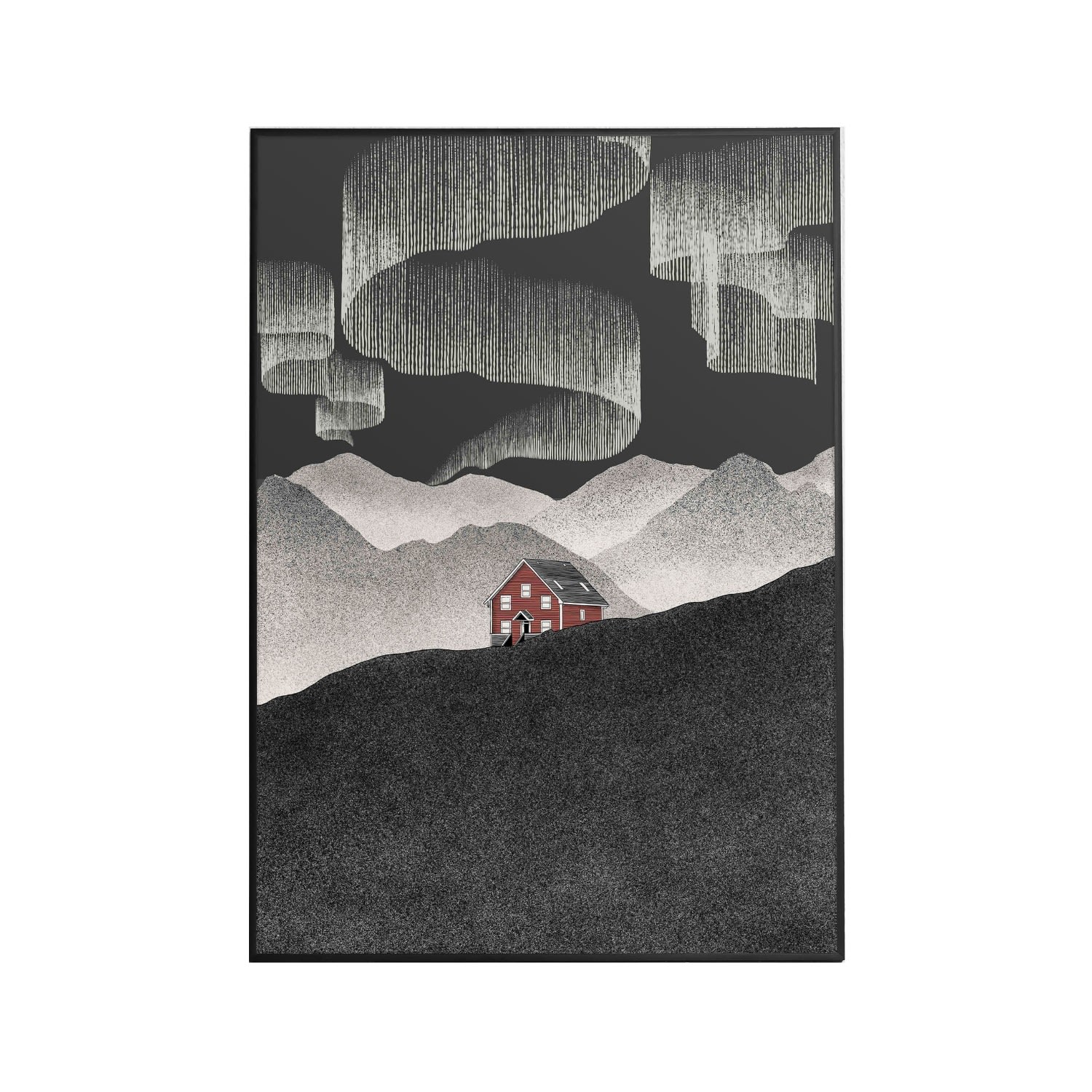 Signed Giclee fine art print illustrated by Abi Overland. An atmospheric piece of art filled with wanderlust and dreams of adventures under the northern lights. Escapism at its finest with this nordic cabin. Full of scandinavian hygge goodness. A perfect addition to your wall decor and home interior. All prints come unframed Giclee fine art print using quality archival inks, printed on 300gsm paper.