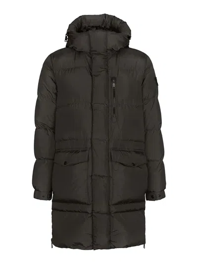 Long black down jacket from add featuring double front closure with double slider metal zip and press studs, two front pockets with flaps with press stud fastening, chest pocket with zip, fixed hood, two maxi internal pockets at the bottom, two internal v