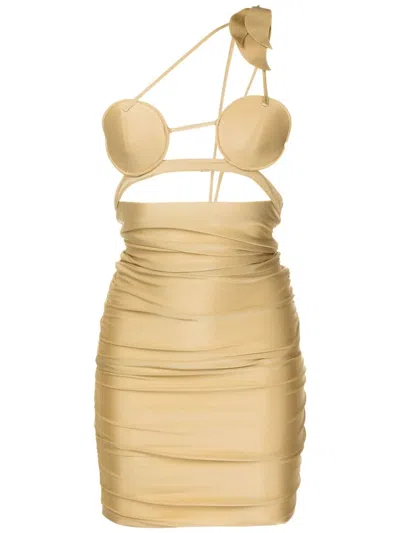 Cherry Bomb draped dress from ADRIANA DEGREAS featuring gold-tone, fitted waistline, draped detailing, off-shoulder, spaghetti straps, fitted waistline and thigh-length.