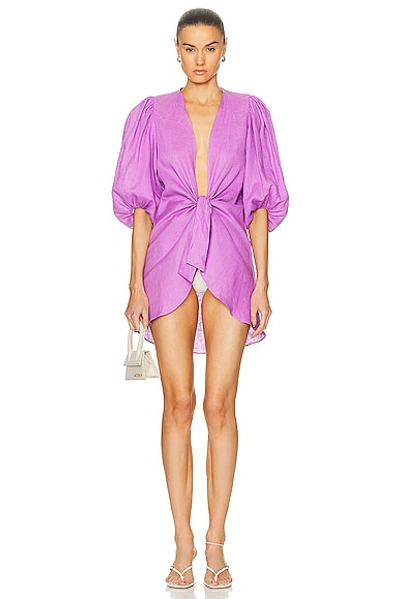ADRIANA DEGREAS Solid Voluminous Sleeves Shirt in Light Purple - Purple. Size M (also in S). 55% linen 45% viscose. Made in Brazil. Hand wash. Open front with tie closure. Puff sleeves with elastic cuffs. ADEF-WS46. CAAF0158R24. About the designer: Adriana Degreas is one of the top luxury beachwear brands in Brazil. Adriana Degreas represents cutting edge designs in beachwear combining both class and elegance for sophisticated women and trend setters. The moulage technique gains power in her creative process and results on elaborated pieces, both sensual and elegant.