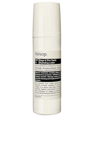Aesop Sage & Zinc Facial Hydrating Lotion SPF15 in Beauty: NA. The ideal hydrator for those who encounter incidental sun exposure daily. This product imparts a layer of Zinc Oxide- which forms a physical barrier to reflect UVA and UVB rays- and provides nourishing hydration.. Vegan and cruelty-free.. Formulated without sulfates, parabens, paraffins, phthalates, silicone, BHA/BHT, oxybenzone, and triclosan.. 50mL. AESR-WU135. B50SK37US. Established in Melbourne in 1987, Aesop aims to formulate skin, hair, and body care products of the highest quality. With safety and efficacy in mind, the brand sources a wide variety of plant-based and laboratory-engineered ingredients to create cutting edge formulas that promote a healthy and balanced routine. In addition to encouraging proactive self-care, Aesop believes in enriching one's lifestyle with art and design. This resonates through the brand's unique apothecary-inspired packaging that transforms any bathroom into a chic spa experience. Aesop is a leader in the skin care and beauty industry and is now B-Corp certified for their sustainable and ethical practices.