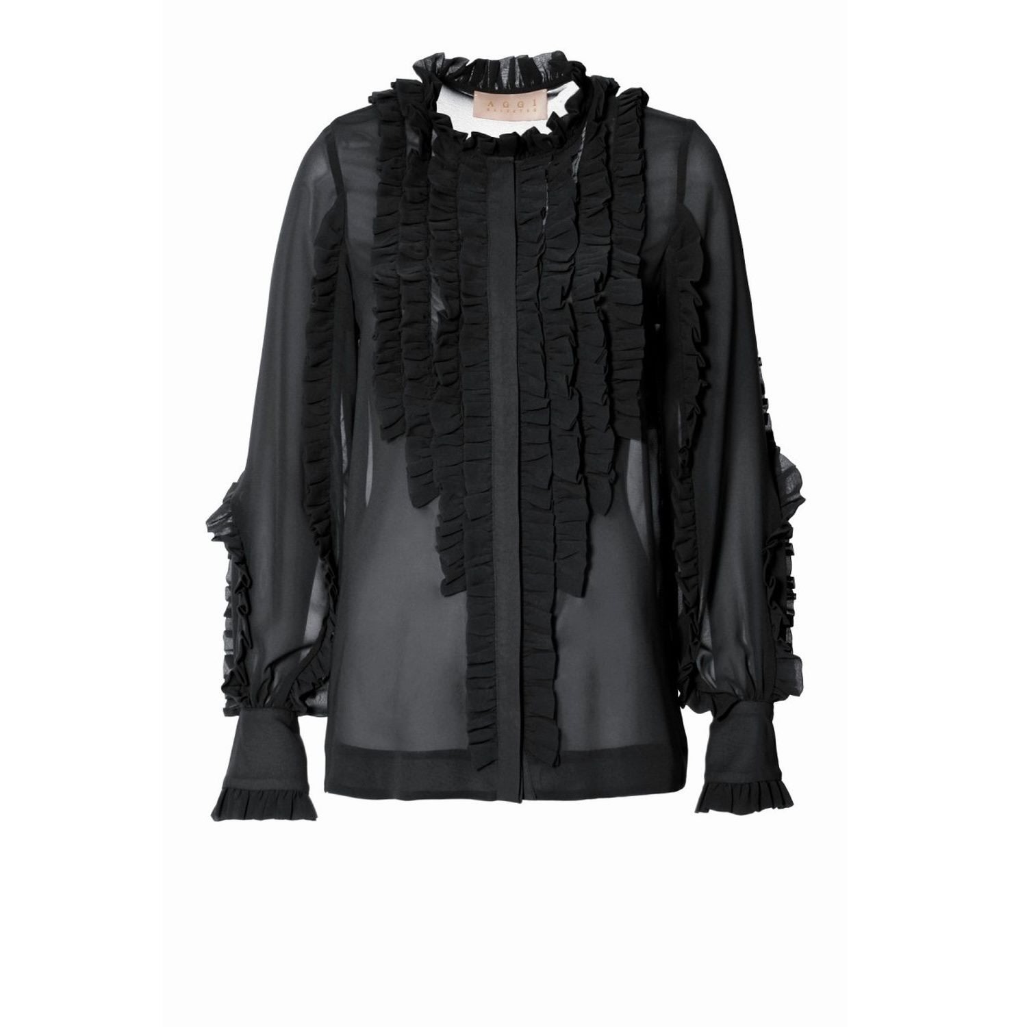 A loose, chiffon blouse decorated with a cornucopia of small frills. Covered with small buttons. Long sleeves with a sewn cuff. Neckline with stand-up collar. We want you to be happy with our products! For the best fit, please refer to the detailed table of our sizes, which you can find in the Size Guide tab, and our detailed measurements in the Sizing tab. Hand wash at 15 degrees C in delicate detergents It is recommended to use fabric softener to prevent static electricity on the fabric Iron at 110 degrees C. COMPOSITION: 80% Silk, 20% Viscose