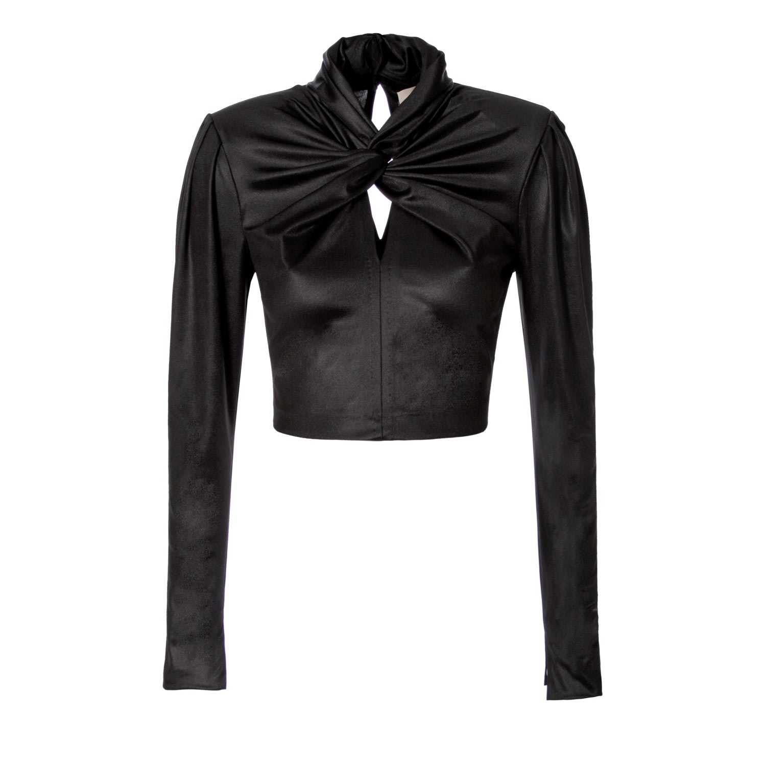 Long-sleeved crop top made of elastic fabric with a subtle sheen, softly emphasizing the silhouette. The neckline with a delicate cutout is decorated with a knot made of abundantly gathered material, crossing under the neck. Long tear-shaped cutout at the back, finished with a fastening with small pearl buttons. Wear it with Judy Power Black Skirt. Please refer to the detailed table of our sizes in the Size GuideE and our detailed measurements which you can find in the Sizing tab, for choosing the best fit. Hand wash with delicate detergents Do not wring out Do not iron COMPOSITION: 47% Viscose, 41% Modal, 12% Spandex