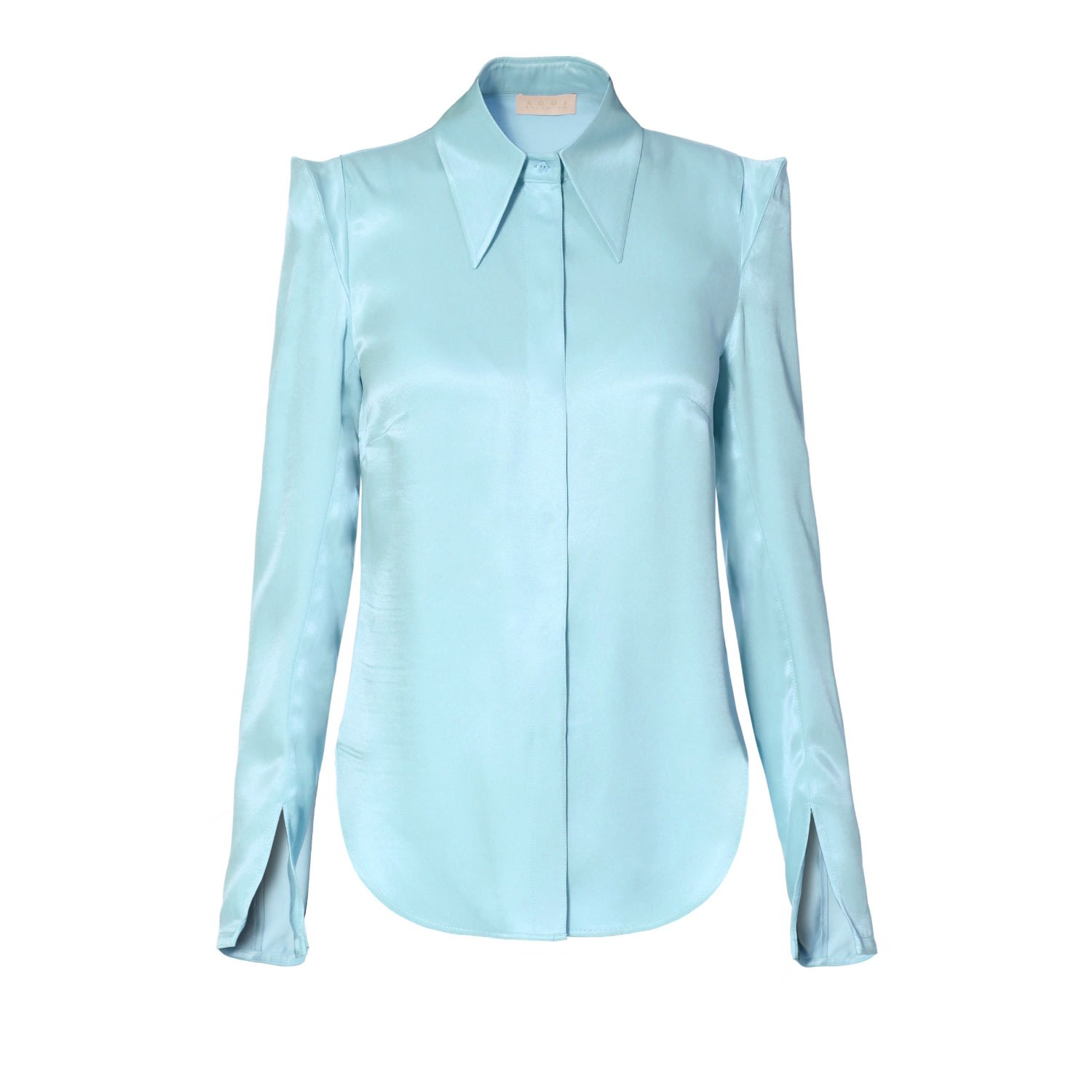 Description: Shirt made of fleshy, noble satin in a soft sky blue color. Pointy shoulders slightly accented with small padding. Covered fastening with subtle small buttons. Long sleeves with slits at the wrists. For a complete elegant look combine it with GWEN HOW BLUE AM I and BLAIR HOW BLUE AM I BLAZER.Composition & Care: Composition:82% Cupro, 18% SilkCare:Hand wash at 15 °C in delicate detergentsIron at 110 °CMeasurements: Length from the highest point on the shoulder: 69cm (XS,S,M,L,XL)Sleeve length: 67cm (XS,S,M,L,XL)Chest circumference: 86cm (XS); 90cm (S); 94cm (M); 98cm (L); 102cm (XL)Model's height: 173cm, size XS