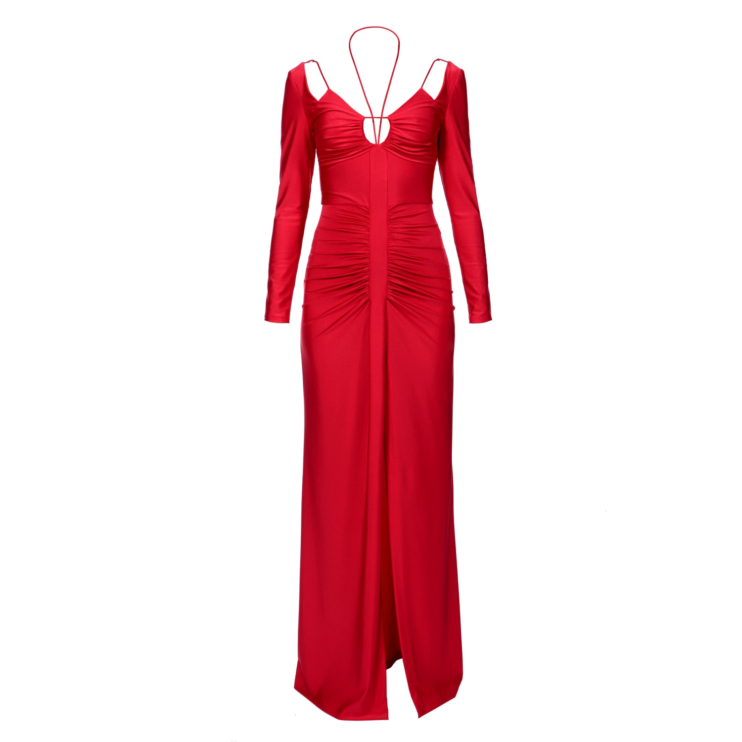 An exquisite evening gown crafted from elastic fabric in a maxi length. This dress features long sleeves and a captivating neckline, supported by delicately connected spaghetti straps. The material is gathered at the bust, waist, and hips for a perfectly slim fit. A long, sensual slit at the front unveils a hint of leg with every movement. Fastened with a zipper at the back, this dress exudes sophistication and allure.Length from the highest point on the shoulder: 158 cm (all sizes)Hips circumference: 92 cm (XS), 96 cm (S), 100 cm (M); 104 cm (L)Chest circumference: 84 cm (XS), 88 cm (S), 92 cm (M), 96 cm (L)Waist circumference: 64 cm (XS), 68 cm (S), 72 cm (M), 76 cm (L)The model is 173 cm and is wearing a size XS