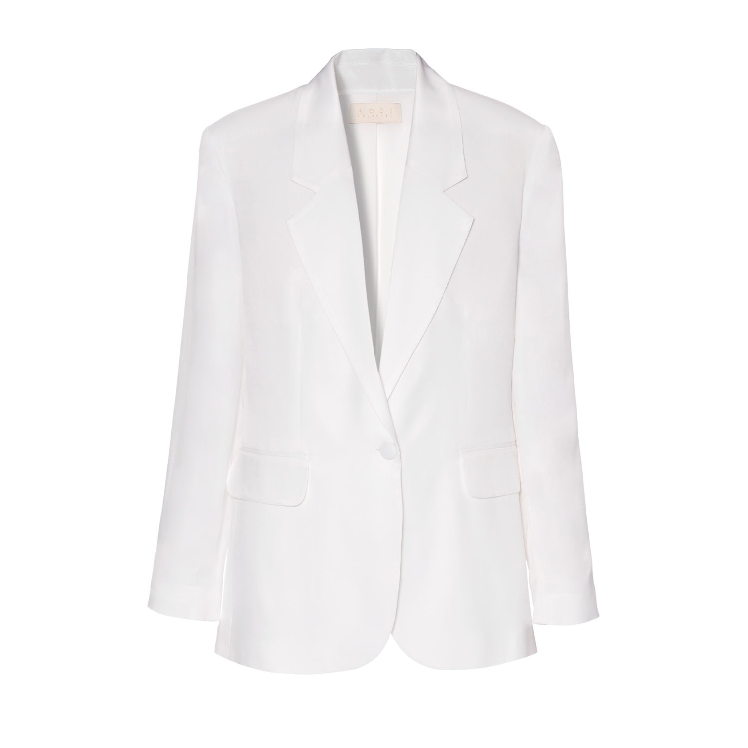 A single-breasted satin blazer with a loose, slightly nonchalant cut, accentuated shoulders, and precisely modeled lapels. This blazer has long sleeves, and softly draped satin fabric. It is lined with chiffon.Length from the highest point on the shoulder: 80cmArmpit width: XS: 50cm, S: 52cm, M: 54cm, L: 56cm, XL: 58cm, XXL: 60cmModel is 173cm and is wearing a size M