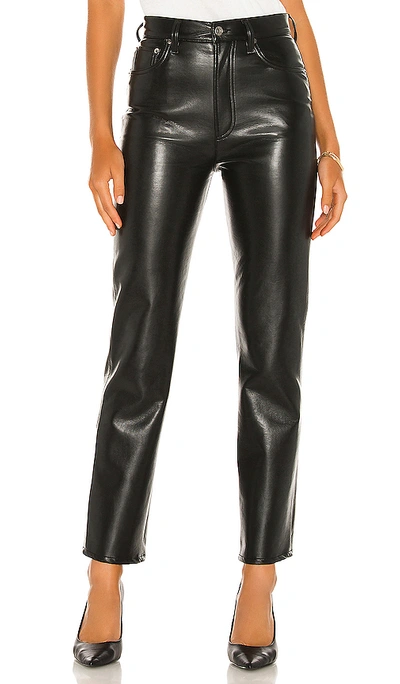 AGOLDE Recycled Leather 90's Pinch Waist in Black. - size 32 (also in 23, 24, 25, 26, 27, 28, 29, 30, 31, 33, 34) AGOLDE Recycled Leather 90's Pinch Waist in Black. - size 32 (also in 23, 24, 25, 26, 27, 28, 29, 30, 31, 33, 34) 50% recycled leather 30% polyurethane 10% viscose 10% polyester. Made in Turkey. Dry clean only. Zip fly with button closure. 5-pocket design. Patent leather fabric. 15 at the knee narrows to 13 at the leg opening. AGOL-WP34. A164-1351. Based in downtown Los Angeles, AGOLDE is a premium denim label dedicated to highlighting youth culture throughout the decades. Instead of simply replicating your favorite styles from the past, they set out to recreate them with a contemporary approach in mind. The styles may emit an irreverent attitude, but AGOLDE is serious when it comes to quality. They use only the most innovative fabrics sourced from around the world and facilitate all product development to create denim of the highest caliber.